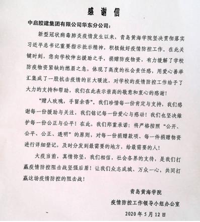 中啟膠建集團華東分公司副經(jīng)理、青島中筑置業(yè)有限公司經(jīng)理李世杰代表公司進行捐贈,并表示,中啟膠建集團時刻以踐行社會責任為己任,大疫當前,我公司愿盡綿薄之力與黃海學院共同擔當,共克時艱。隔山隔水不隔愛,封城封路不封心,讓我們眾志成城、守望相助,形成合力共同打贏這場疫情防控阻擊戰(zhàn)!