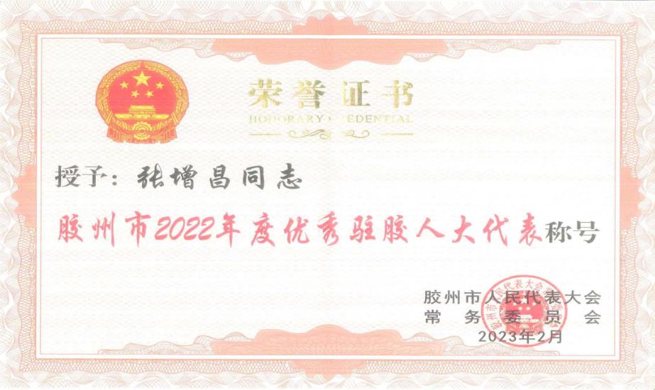 2月23日,膠州市人大工作創先爭優座談會在市會議中心召開,會上隆重表彰了膠州市2022年度基層人大工作先進單位、優秀人大代表、優秀駐膠人大代表、優秀人大代表建議和人大代表“書香家庭”。青島市人大代表、中啟控股集團黨委書記、總裁張增昌榮獲“膠州市2022年度優秀駐膠人大代表”稱號,并上臺領獎;膠州市人大代表、中啟膠建集團黨委書記、總經理郭道盛獲評“膠州市2022年度優秀人大代表建議”和膠州市人大代表“書香家庭”稱號。