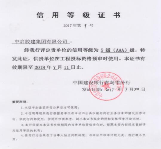 近日,中啟膠建集團有限公司順利通過中國建設(shè)銀行信用等級AAA復(fù)評工作,此次復(fù)評主要考核企業(yè)在銀行的信譽情況。