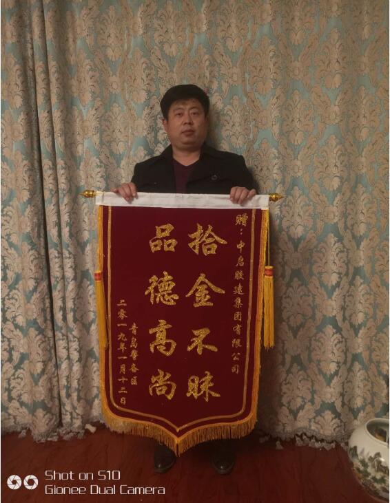中啟膠建集團建設項目管理公司員工郭允成在青島春和景明小區地下車庫撿到一個錢包,包內有大量現金和各種證件,郭允成同志想失主所想,急失主所急,立即通過各種途徑尋找失主,通過失主的工作證,聯系到失主工作單位青島警備區,找到失主并把錢包歸還。失主為表達感謝之情,經過青島警備區溫司令批示特向中啟膠建集團有限公司郭允成同志授予“拾金不昧”錦旗。