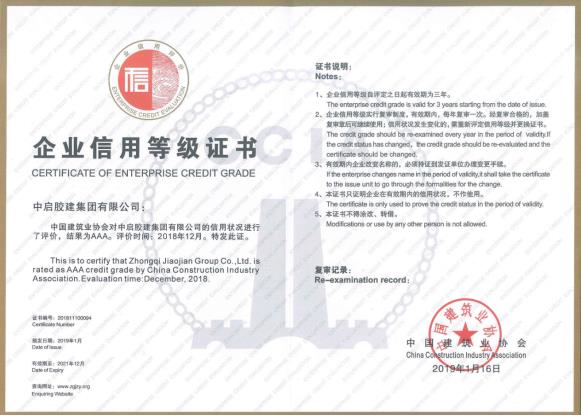 近日,中啟膠建集團有限公司榮獲2018年度“全國建筑業AAA級信用企業”稱號,有效期至2021年12月。