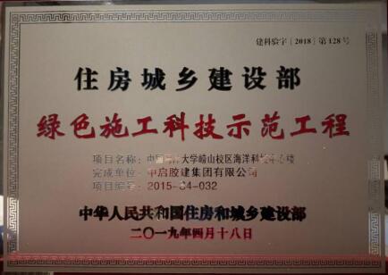 日前,中啟膠建集團建筑七公司施工的中國海洋大學嶗山校區海洋科技中心樓項目獲得住房和城鄉建設部綠色施工科技示范工程授牌。