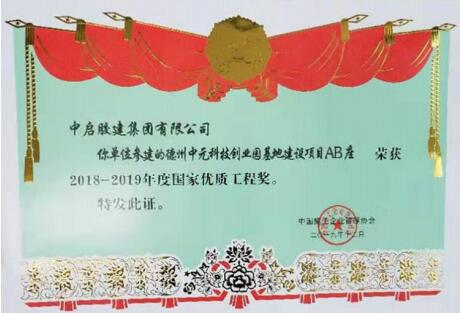 2019年12月8日,國家優質工程獎總結表彰大會在國家會議中心召開,中啟膠建集團青島公司參建的“德州中元科技創業園基地建設項目AB座工程”榮獲國家優質工程獎。