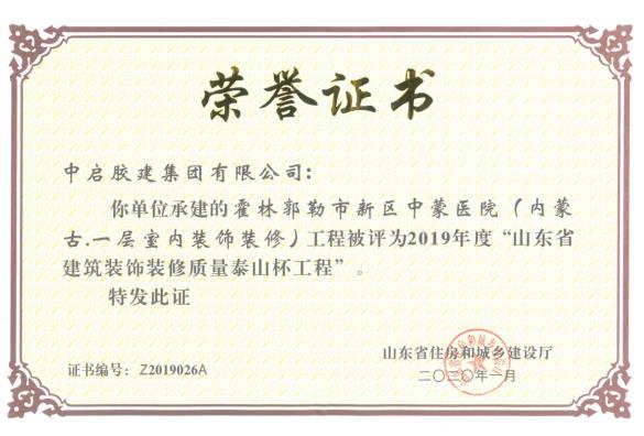 近日,由中啟膠建集團有限公司建筑二分公司承建的霍林郭勒市新區中蒙醫院工程建設項目喜獲2019年度山東省建筑裝飾裝修質量“泰山杯”獎項。