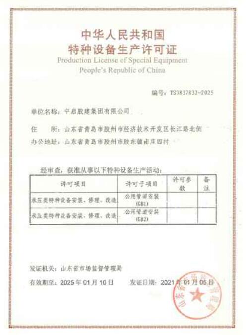 日前,經(jīng)集團(tuán)總工辦公室牽頭,在集團(tuán)各部門和各生產(chǎn)經(jīng)營(yíng)單位,特別是建筑七公司、建筑九公司的大力支持和共同努力下,中啟膠建集團(tuán)有限公司順利完成公用壓力管道安裝GB2許可升級(jí)和GB1許可取證工作。