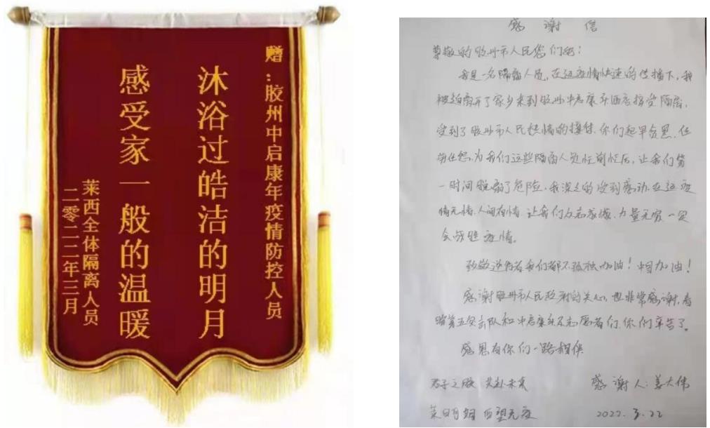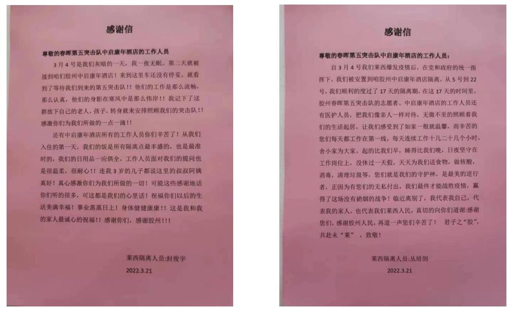 在這場持續(xù)性的抗疫行動中,中啟康年酒店始終堅守防疫第一線,積極肩負起為給隔離人員提供優(yōu)質精細化服務的社會責任,收到了來自隔離人員及防疫突擊隊的一致好評,一封封真摯懇切的感謝信接踵而來。打贏這場“戰(zhàn)役”需要我們酒店上下一心,以實際行動配合各部門行動,認真遵循集團公司和防疫指揮部的要求,努力完成各項經營指標以及防疫抗疫工作,爭做酒店行業(yè)模范標兵。