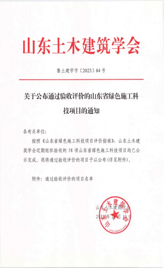 自項目立項以來,集團、分公司、項目部對該項目的綠色施工實施情況高度重視,確定了綠色施工實施方案并在項目上落實;項目定期進行自評,及時對比分析各項指標完成情況,并積極采取改進措施。通過不懈努力,該項目于2022年通過了山東省綠色施工科技項目的中期評價,并于今年11月順利通過了山東省綠色施工科技項目評價驗收。通過評價,項目達到預期制定的“五節一環?!蹦繕耍G色施工科技示范效果良好。