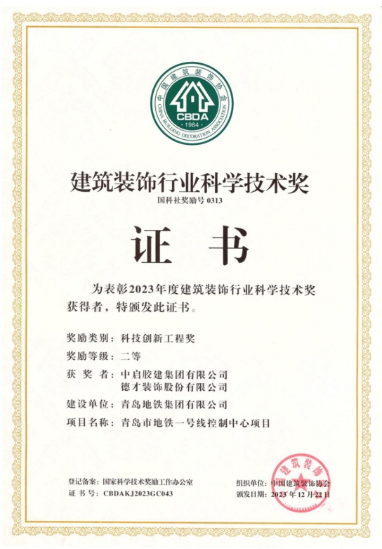 12月15日,中國建筑裝飾協(xié)會公布了2023年度中國建筑裝飾行業(yè)科學(xué)技術(shù)獎(jiǎng)獲獎(jiǎng)名單。由中啟膠建集團(tuán)建設(shè)的青島市地鐵一號線控制中心項(xiàng)目榮獲中國建筑裝飾行業(yè)科學(xué)技術(shù)獎(jiǎng)(科技創(chuàng)新工程獎(jiǎng))二等獎(jiǎng)。這是公司首次獲得該獎(jiǎng)項(xiàng),創(chuàng)中啟膠建集團(tuán)技術(shù)創(chuàng)新領(lǐng)域的先河。