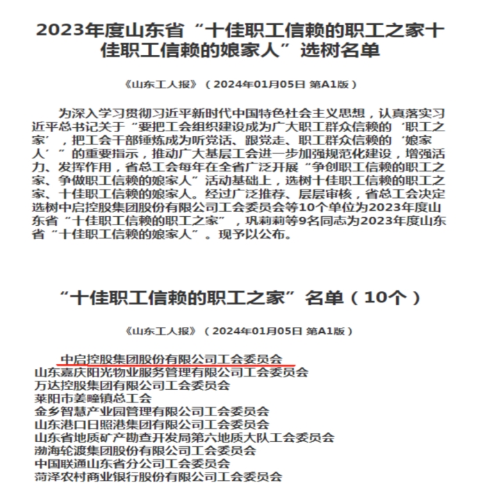 近日,山東省總工會在全省范圍內開展“爭創職工信賴的職工之家、爭做職工信賴的娘家人”選樹活動。經過廣泛推薦、網絡投票、現場考察等層層審核,全省共選樹10個單位為2023年度山東省“十佳職工信賴的職工之家”,中啟控股集團股份有限公司工會委員會成功獲評此項榮譽。