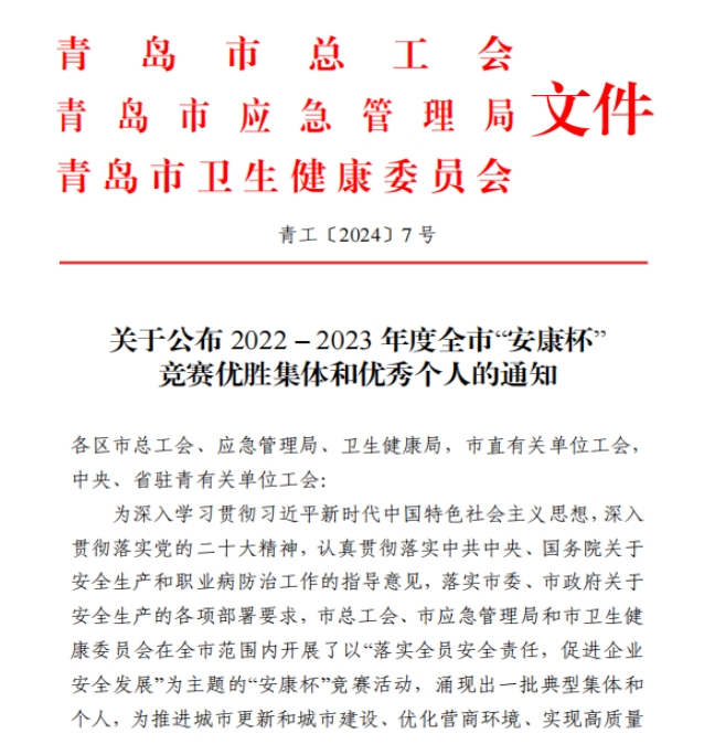 近日,青島市總工會、青島市應急管理局、青島市衛生健康委員會聯合公布了2022-2023年度全市“安康杯”競賽獲獎名單,中啟膠建集團有限公司獲評青島市“安康杯”競賽優勝單位,中德中小企業創新研發示范基地項目班組獲評青島市“安康杯”競賽優勝班組。