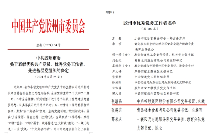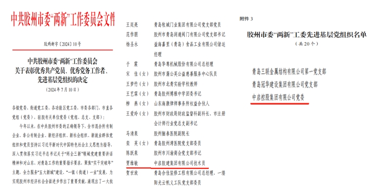 近日,市各級(jí)黨委為表彰先進(jìn)、弘揚(yáng)正氣,激勵(lì)廣大黨員和各級(jí)黨組織牢記囑托、勇?lián)姑趹c祝中國(guó)共產(chǎn)黨成立103周年之際,通報(bào)表?yè)P(yáng)了一批優(yōu)秀個(gè)人和先進(jìn)集體,集團(tuán)黨委喜獲多項(xiàng)殊榮。集團(tuán)黨委書記、總裁張?jiān)霾緲s獲青島市非公經(jīng)濟(jì)組織“黨員先鋒崗”和膠州市優(yōu)秀黨務(wù)工作者稱號(hào);中啟膠建集團(tuán)裝飾公司賈維敏同志榮獲膠州市委“兩新”工委優(yōu)秀共產(chǎn)黨員稱號(hào);中啟控股集團(tuán)黨委榮獲膠州市委“兩新”工委先進(jìn)基層黨組織稱號(hào);集團(tuán)黨委所屬的中啟控股集團(tuán)機(jī)關(guān)黨支部、中啟膠建集團(tuán)膠州公司黨支部和中啟膠建集團(tuán)青島公司黨支部獲評(píng)“2023年度膠州市五星級(jí)黨組織”稱號(hào)。