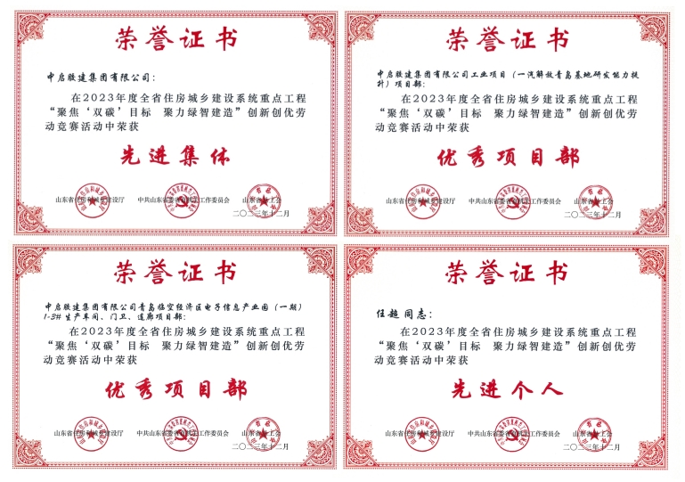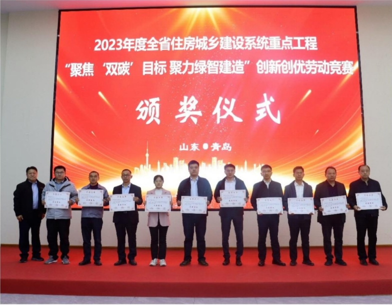 會議同期為青島市獲得2023年度全省住房城鄉建設系統重點工程“聚焦‘雙碳’目標 聚力綠智建造”創新創優勞動競賽榮譽的先進集體、優秀項目部和先進個人進行了頒獎。公司獲評“先進集體”榮譽稱號,公司工業項目(一汽解放青島基地研發能力提升)項目部和青島臨空經濟區電子信息產業園(一期)1-3#生產車間、門衛、連廊項目部被評為“優秀項目部”,任超獲評“先進個人”。