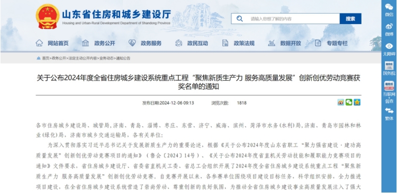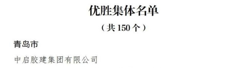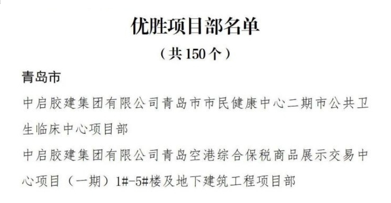 12月6日,山東省住房和城鄉建設廳官網公布了2024年度全省住房城鄉建設系統重點工程“聚焦新質生產力 服務高質量發展”創新創優勞動競賽獲獎名單,中啟膠建集團有限公司榮獲“優勝集體”稱號,青島市市民健康中心二期市公共衛生臨床中心項目部和青島空港綜合保稅商品展示交易中心項目(一期)1#-5#樓及地下建筑工程項目部被評為“優勝項目部”稱號。