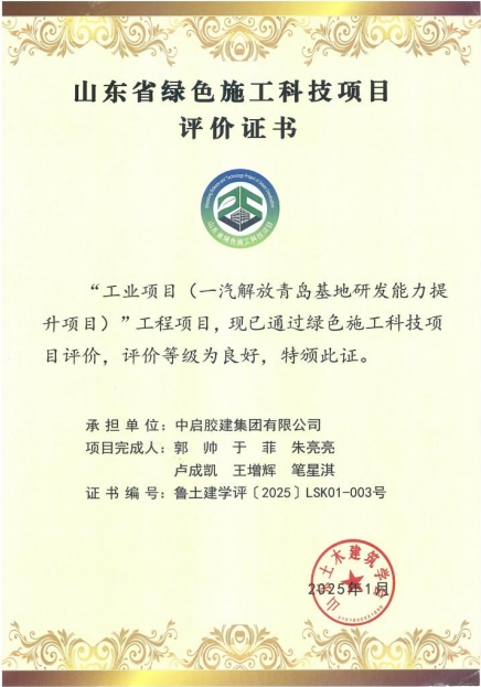 近日,山東土木建筑學會發布《關于公布通過驗收評價的山東省綠色施工科技項目的通知》,中啟膠建集團承建的工業項目(一汽解放青島基地研發能力提升項目)順利通過山東省綠色施工科技項目驗收評價。
