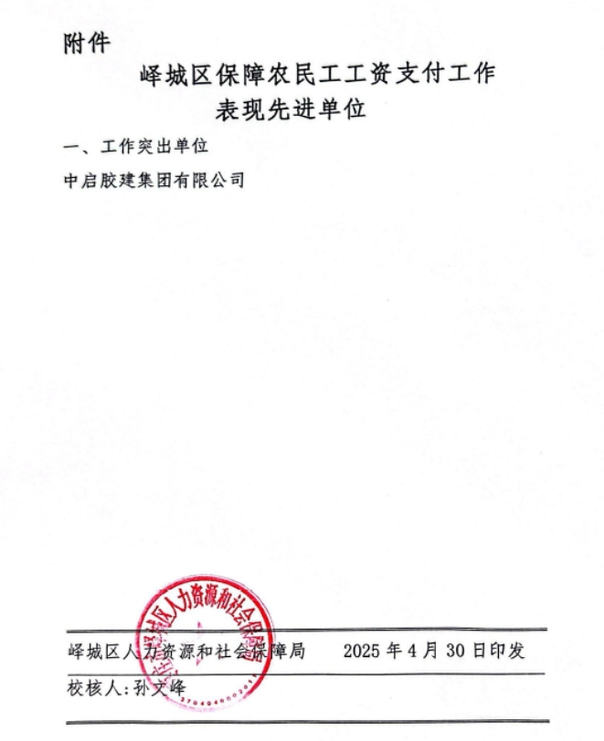 公司堅定貫徹落實上級關于根治欠薪工作的決策部署,由華東分公司承建的棗莊市嶧城區人民醫院項目在保障農民工工資支付工作中擔當作為,履職盡責。棗莊市嶧城區人力資源和社會保障局對公司進行了通報表揚,公司被評為嶧城區保障農民工工資支付工作先進單位。