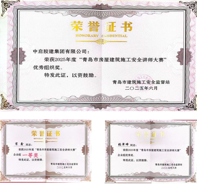 參賽組分為安全管理類、安全技術類、科技類,涵蓋了建筑施工安全管理、大型設備安全管理、高處作業、有限空間等類別。經過篩選、預選、決賽,共評選出企業優秀組織獎4個,企業個人一等獎2個、二等獎4個、三等獎6個、優秀獎20個。集團選送參賽的兩位員工:華東公司宋鑫獲得企業組一等獎、膠州公司張澤帥獲得企業組優秀獎。同時中啟膠建集團有限公司獲得“優秀組織獎”。