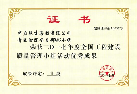 2017年6月29日,中國建筑業協會舉辦的全國工程建設優秀質量管理小組活動成果交流會在四川成都舉行,由中啟膠建集團建筑七公司青醫附院項目部QC小組發布的《研創地下室抗浮錨桿節點處防水新技術》榮獲2017年度全國工程建設質量管理小組活動優秀成果二等獎。